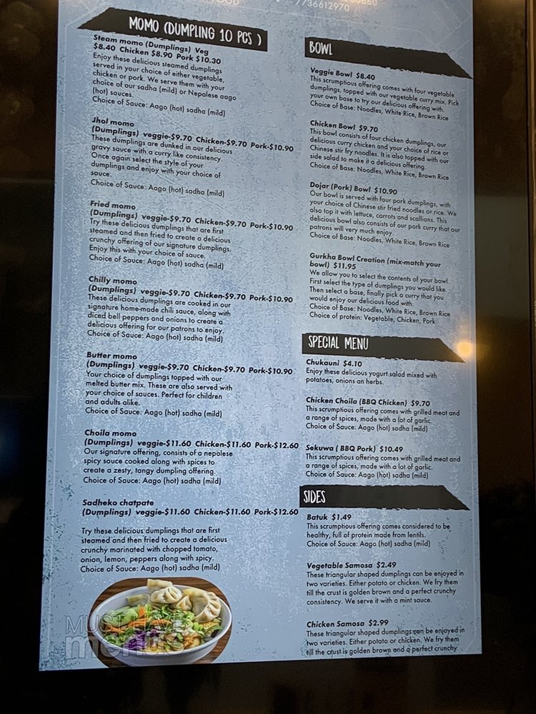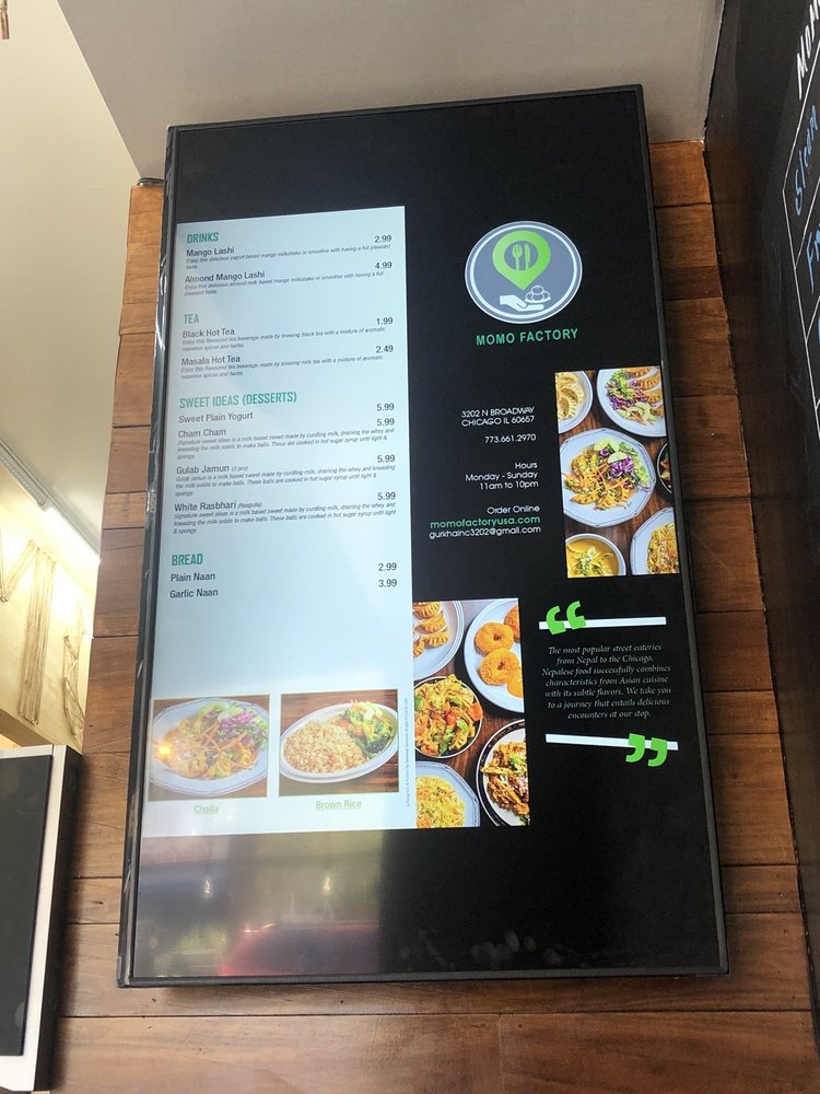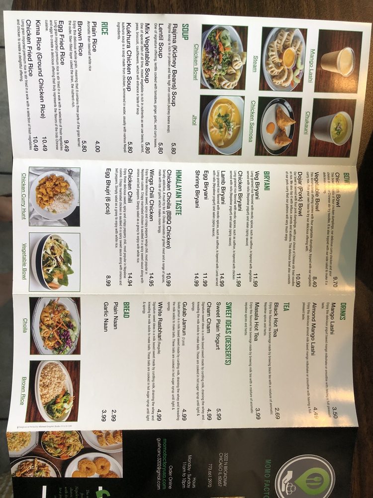 Introducing the menu at Momo Factory, a Himalayan/Nepalese - Indian - Asian Fusion restaurant located in Chicago. The restaurant offers various utilities such as reservations, delivery, takeout, vegan options, vegetarian options, and more. The appetizers include Vegetable Samosa, Batuk, Samosa Chaat, Aalu Tikka Chaat, Chana Chatpate, Fiery Aalu Pakora, Chukani, fries, and Chicken Samosa. For those looking for unique dishes, try the Fish Momo, Fish Bhatti Curry Momo, and Wild Spicy Curry Momo (Fish). Customers have raved about the flavorful dishes, especially the chicken tikka masala, veggie samosas, and various momos. The cozy ambiance and attentive staff add to the overall dining experience, making Momo Factory a must-visit for those craving authentic and delicious Nepalese cuisine.